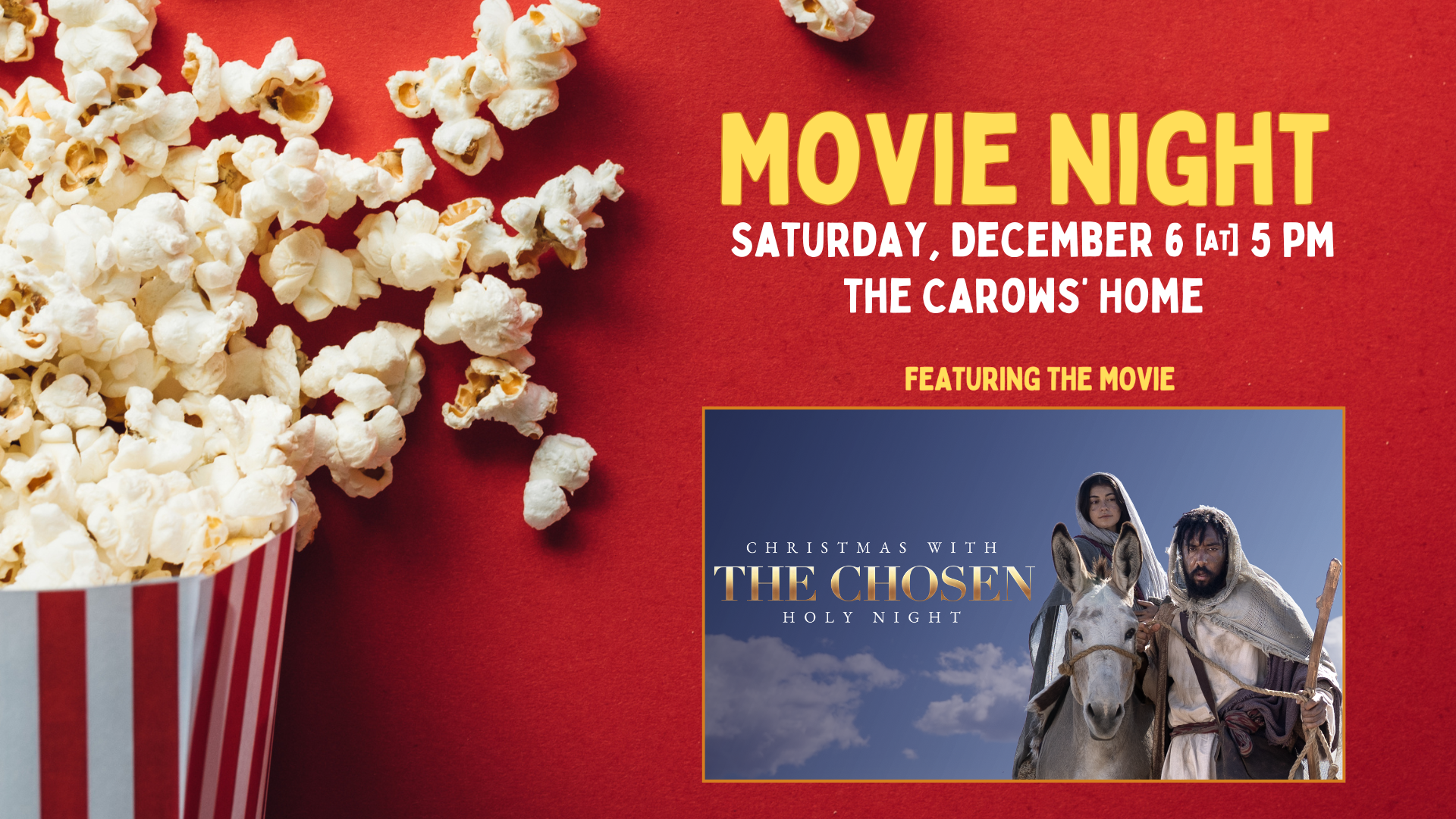 Join us in ushering in the holiday season with a movie night watching Christmas with The Chosen: Holy Night! We will be gathering at the Carows' home and pizza will be provided for supper. Childcare will be available.